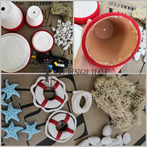 19. Pripravimo si naše pobarvane lončke in podstavke, okrasne kamenčke, islandski mah in vse dodatke, ki smo jih izdelali iz polimerne gline.