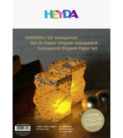 Komplet origami papirja vsebuje 10 prozornih listov z enostranskim potiskom (zvezdice) v zlati barvi. Namenjen je kreaciji 10 lučk. Velikost: A4. Teža: 90 gsm.